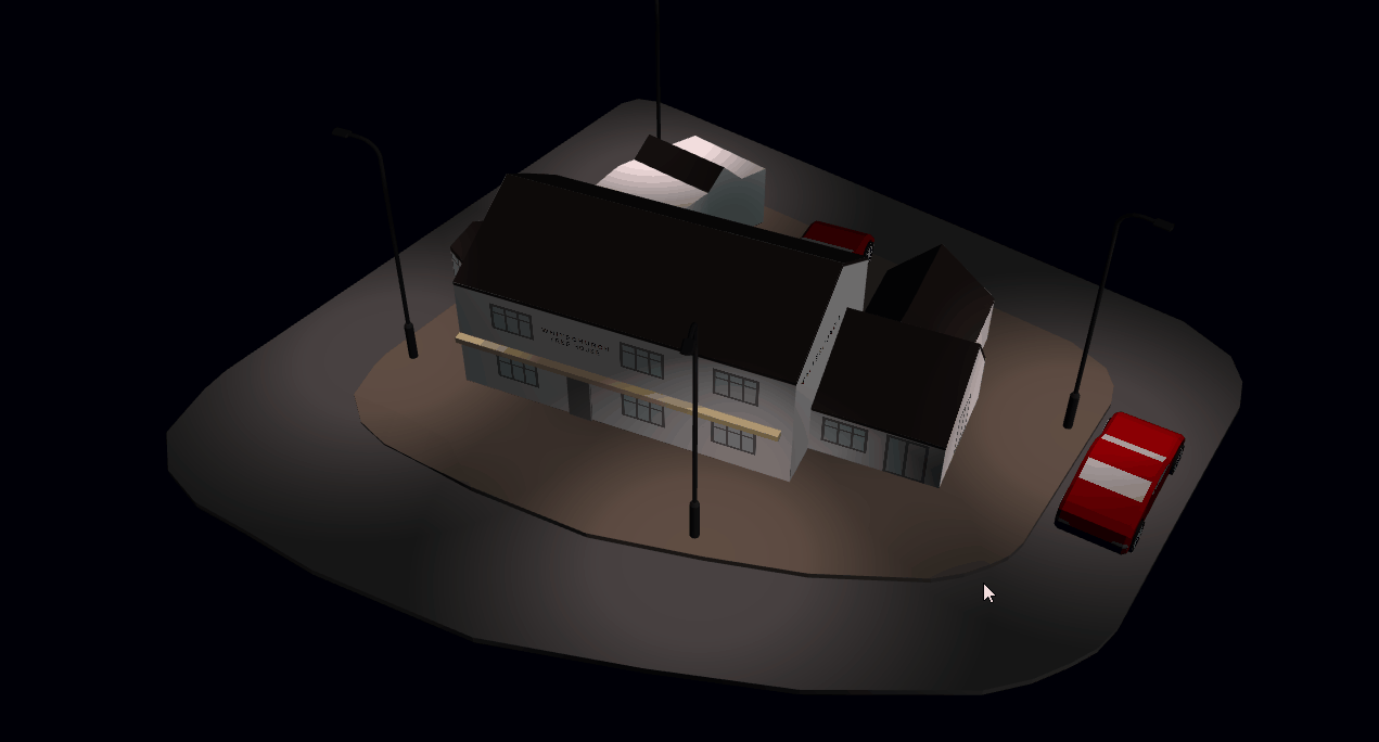 A 3D rendering of Whitechurch, Durham, complete with an animated moving car and interactive elements, made with OpenGL.